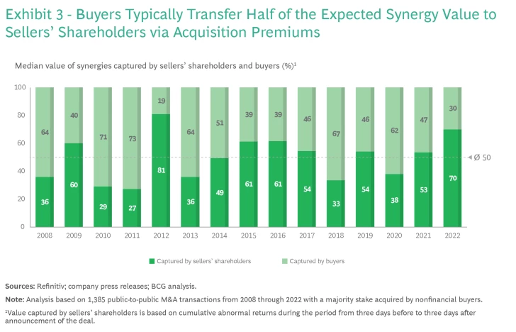Merely identifying potential synergies is a far cry from realizing them, however, and their value diminishes if the buyer simply passes them on to the seller via a higher purchase price. Our research reveals that, over the past 15 years, buyers in public M&A deals have retained only about 50% of synergies; the rest tends to be factored into the purchase price, although this rate fluctuates with market conditions. (See Exhibit 3.) Our studies repeatedly indicate that insufficient or unrealized synergies are among the main reasons why some deals are deemed failures.