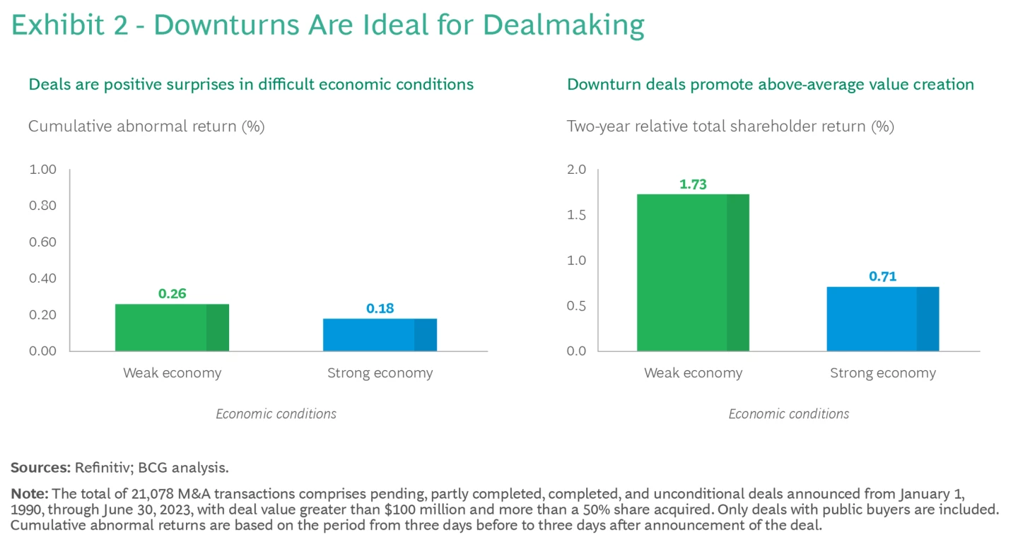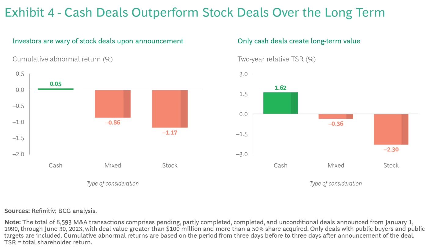Common wisdom suggests that overpaying is never profitable, but our research finds that this is not entirely accurate. Although the greatest value creation typically arises from deals with below-average multiples, maximum benefits emerge when low multiples are paired with high premiums over current market valuations. Perhaps counterintuitively, this insight suggests that deal makers should seek opportunities where they can afford a substantial premium over an asset’s current market value due to the asset’s low valuation and the potential for significant synergies. In simpler terms: look for bargains, especially in today’s fluctuating market environment.